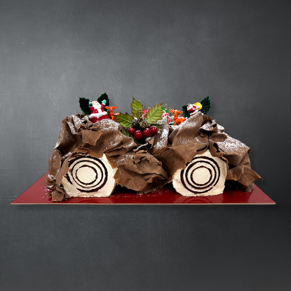 This stunning dessert is made of sponge cake rolled with a whipped creme fraiche and covered with rich chocolate frosting. Decorated with your favourite Christmas icons.